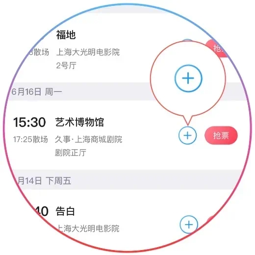 3、开售前,可在进入排片列表后,选择合适的影片和影院,点击右侧加号“+”图标,将影片提前加入“我的日程”。